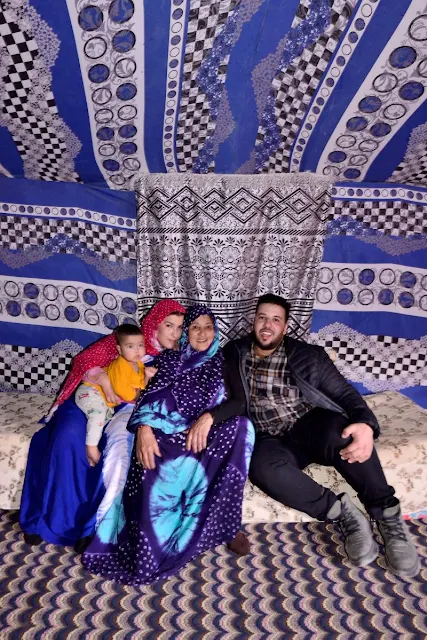 | Abdelbari Mustafa dans sa famille à Boujdour, sous la tente traditionnelle. (Photo : Thierry Nectoux) |